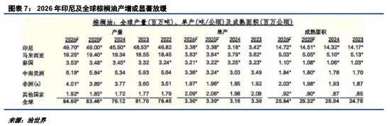 因老树翻种率不足及种植面积下滑,马来西亚棕榈油已经出现明显的增长瓶颈,随着去年劳动力改善的影响减退,2026年面临小幅的产量同比下滑压力。印尼棕榈油表现亦不乐观,除了翻种率不足导致的树龄老化及产增放缓之外,大量非法种植园的罚没及移交也引发了对其后续产量的担忧。