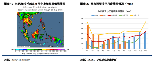 然而,马棕10月前20日超预期的产量增幅主要来自沙巴及沙捞越异常高的产量表现,其延续性有待观察,单凭阶段性产量表现较高就去上修或有些操之过急。9月中上旬沙巴及沙捞越经历了强降雨甚至洪涝,棕榈油收获节奏受到了较大影响,低基数效应在某种程度导致了这些地区在本月同期超高的产量增长幅度。马棕9月下旬收获情况随降雨减弱而好转,产量基数回升预计将有助于其10月全月产量增幅缩窄,或随后削弱市场对马棕产量预期大幅上修的担忧,保持关注。
