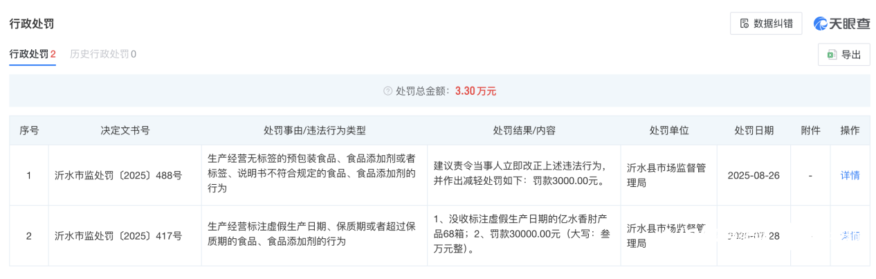 值得一提的是,在“擦边”保健品之外,其他普通食品的售卖也存在一定安全风险。南都记者调查发现,优选湾直播间推荐的“润畔”莫斯科肠及酱香肘花,其背后生产商山东润泉食品有限公司在今年曾因生产经营无标签的预包装食品、食品添加剂或者标签、说明书不符合规定的食品、食品添加剂的行为,以及生产经营标注虚假生产日期、保质期或者超过保质期的食品、食品添加剂的行为累计被沂水县市场监督管理局处以罚款3.3万元,并没收了标注虚假生产日期的68箱亿水香肘产品。