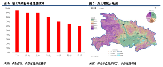 湖北江汉平原产区总体耕种条件便利,地区能实现“一年两耕”,主要流行种植模式分为“水稻-油菜/小麦”或“芝麻-油菜/小麦”2类。相较而言,湖泊较多的产区更倾向于种植水稻,因湖北地区水稻镉含量偏低,在全国范围内具有销售优势,这部分地区以“水田”为主。由于水田地区本身排水相对困难,而近期降雨进一步加大了排水难度,目前这部分产区菜籽种植面积下滑概率较大。部分农户可能改种小麦或直接弃种。